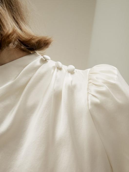 Asymmetry is another type of symmetry. The blouse is made of 100% mulberry silk which ensures the breathability and softness. Sculpted like the goddess of intellect and wisdom Phoebe, buttons at the left shoulder and slight pleats at the neckline slim the upper body and flatter the figure, emphasizing the female confidence. The color lily white remains classic, with puff sleeves and longer cuffs for a fresh, modern feel.-