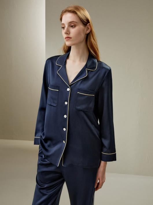 An update on a best-selling design, the Long Sleeve Silk pyjama Set with Contrast Piping will provide you with the ultimate comfort. Casual yet stylish, this set features contrast piping along the collar and front edge, pockets, and cuffs, as well as the side pant seams and hems. Ideal worn together or separately, these versatile pyjamas will look just as good worn out with your favorite sneakers as they will when worn to bed.-