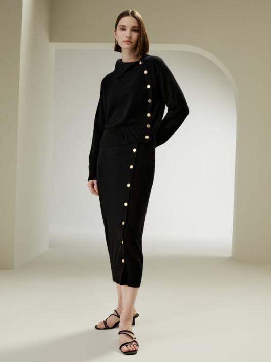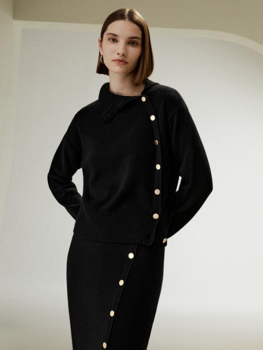 Breaking away from the conventional look of pieces crafted from premium materials, the asymmetrical arrangement of golden buttons adds an element of intrigue and sophistication to the overall aesthetic of this 100% cashmere sweater, while simultaneously offering lux and style.-
