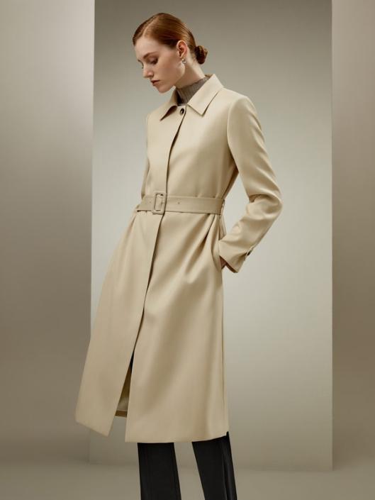 Taking on a classic minimalistic style, this straight cut trenchcoat presents a timeless and sophisticated look. It features a hidden placket design that adds a touch of discreet charm. The straight-shoulder sleeves give it a sleek and modern silhouette. Dark brown horn buttons adorn the coat, enhancing its classic appeal. The water repellent treatment makes it suitable for outdoor wear, whether for business or travel.-