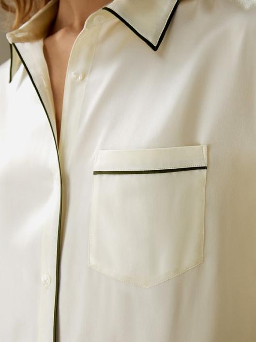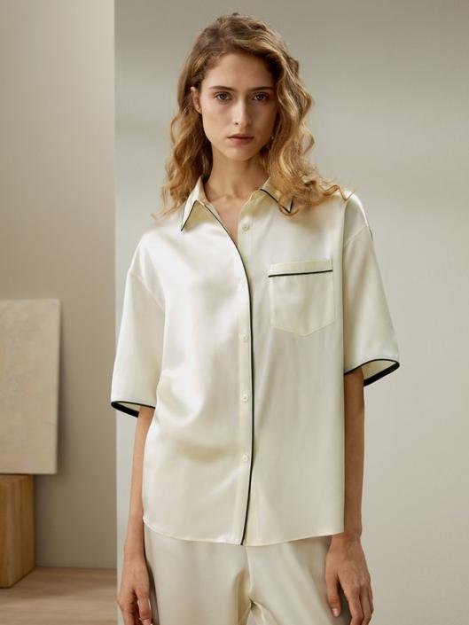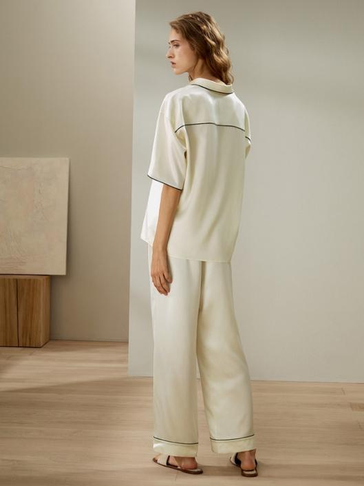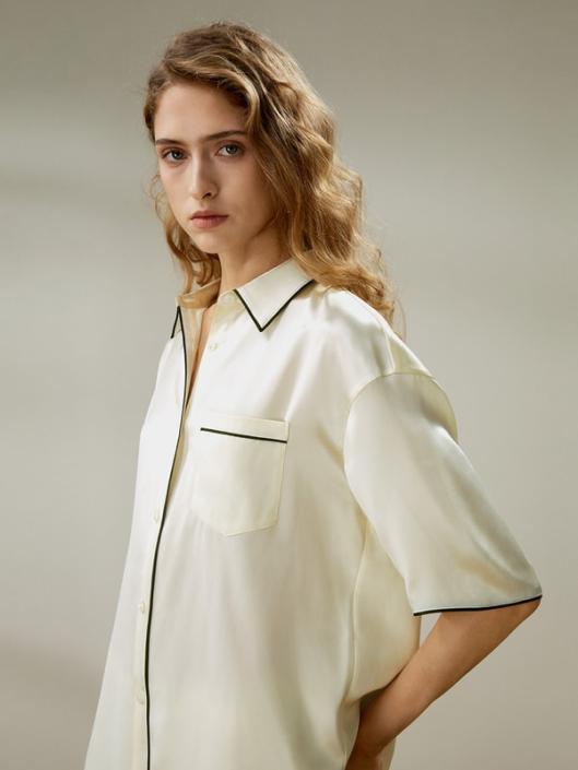 The pajama set features contrast piping details that subtly accentuate the clean lines and flattering silhouette, while the short sleeves allow for ease of movement. The smooth textile glides across the skin leaving a gentle caressing sensation against your skin, ensuring a blissful night’s sleep.-