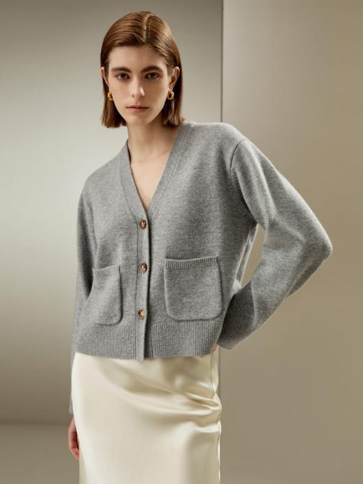 Made of 70% wool and 30% cashmere, this drop-shoulder V-neck cardigan with a loose fit features a single-sided plain weave. The design is simple, with classic horn buttons, making it an essential for the autumn wardrobe. It can be worn from early to late autumn and pairs well with dresses, skirts, or pants, and looks particularly elegant when paired with tall boots.-