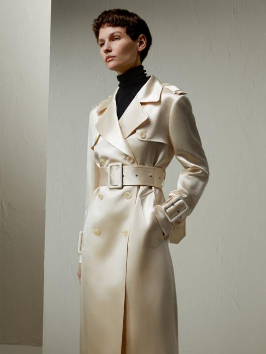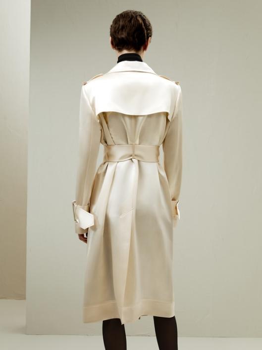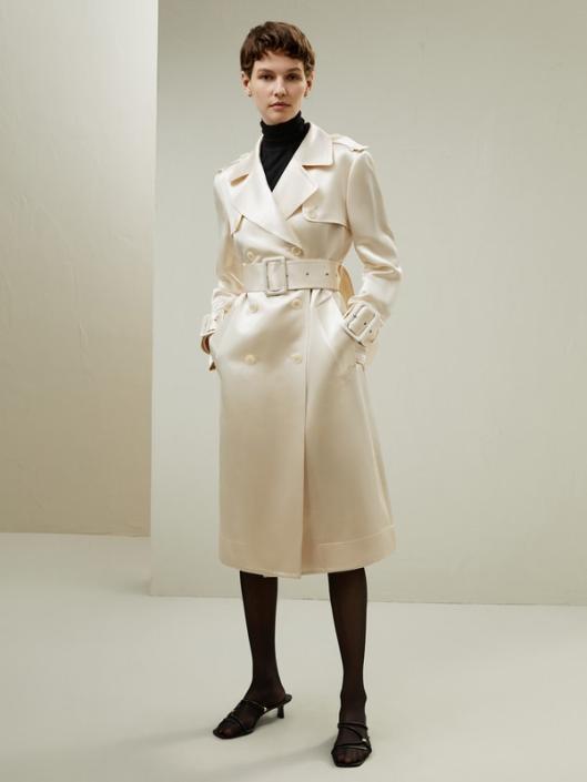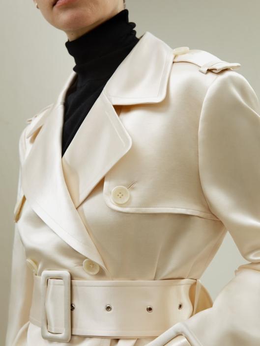 The trench coat’s clever utilization of adjustable belts, straps, and textured fabric creates a visually captivating and dynamic effect, elevating its overall appearance with a sense of depth and sophistication. The white tone presents a classic and timeless intellectual style. Made from soft mulberry silk and ultra-merino wool, this coat is suitable for all seasons.-