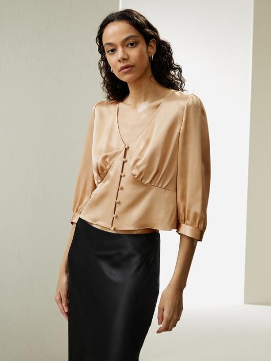 LILYSILK X Sonia Selaire.This silk top exudes subtle sensuality and classic elegance. Featuring a vintage-inspired button-and-loop closure and three-quarter sleeves creating an alluring silhouette. With a cropped cut and shiny silk charmeuse, the irresistibly flirty plunged neckline completes the look. Go-to pieces for multiple occasions.-