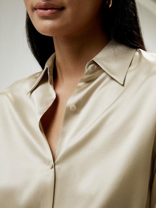 The ruffled silk blouse designed by Natasha Gibson combines elegance and casualness. Drawstrings, both hidden inside and visible as decorative elements, create the ruffles at the hem and on the sleeves, for an interesting, modern, and flattering effect. The blouse can be worn all year round: In the summer open, as an elegant jacket over a top – ruffled or not. In the winter months closed, as an elegant blouse for a job outfit or an evening event.-