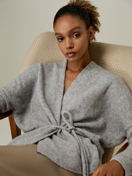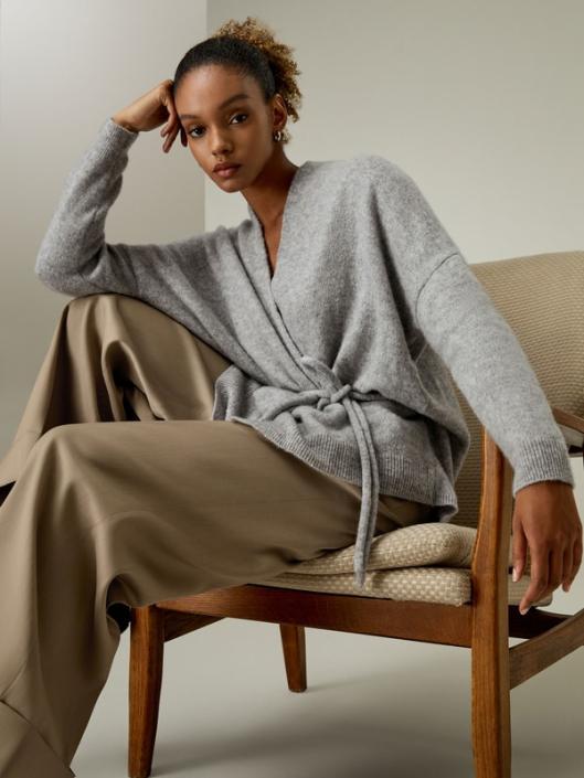 This wrap cardigan is made from a luxurious blend of soft cashmere and silk, offering an elevated take on loungewear. It features high rib detailing at the sleeves and hem, and can be styled with the matching lounge pants for a complete, cozy look.-