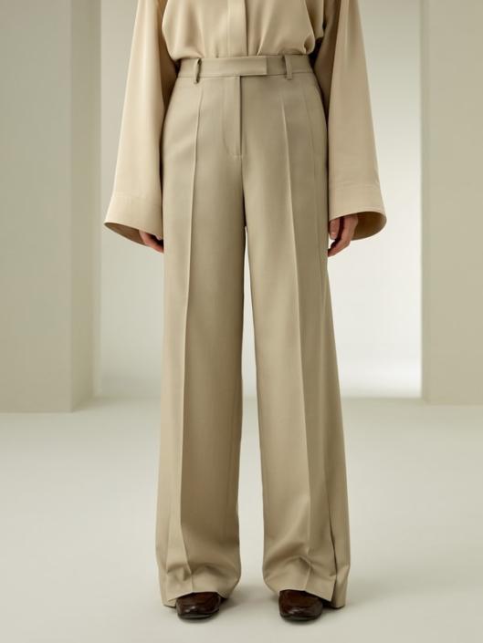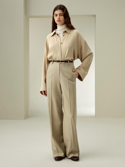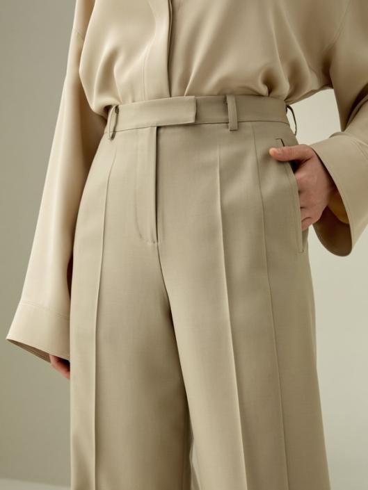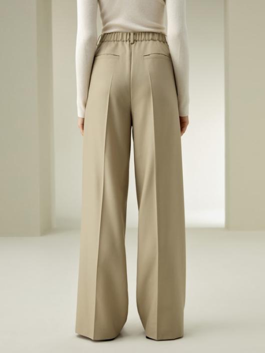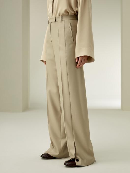 These versatile straight-leg pants, crafted from a blend of 90% wool and 10% silk, feature unique button details at the hem for added style and functionality. The fabric is machine washable, providing both luxurious comfort and effortless care. Fasten all the buttons for a flattering straight-leg look, or adjust them for a personalized flair that complements any outfit and shoe choice. The elastic waistband offers comfort and a slimming effect, while the seamless design ensures a chic, minimalist aesthetic.-