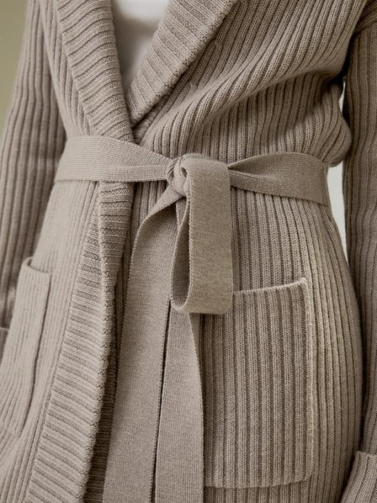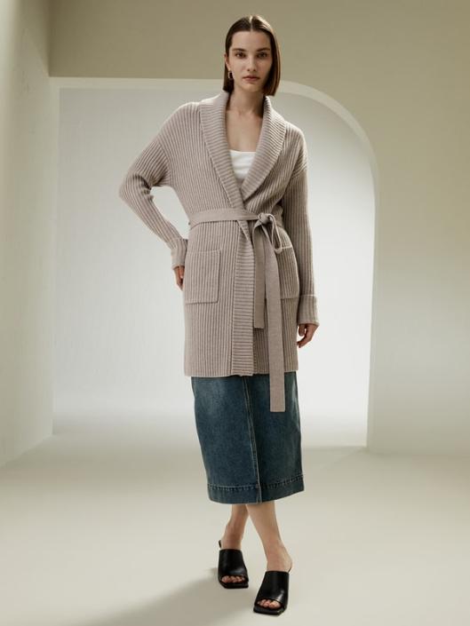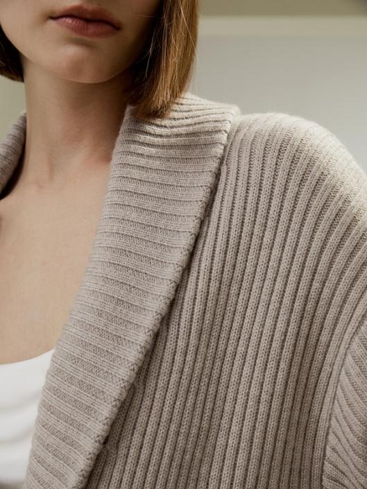 Adorned with an exquisite rib pattern design and a timeless shawl collar, this impeccably versatile Merino wool cardigan complements any occasion. Experience pure relaxation in the comfort of your home or express your personal style at refined gatherings.-