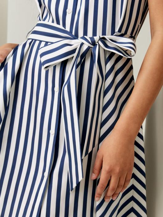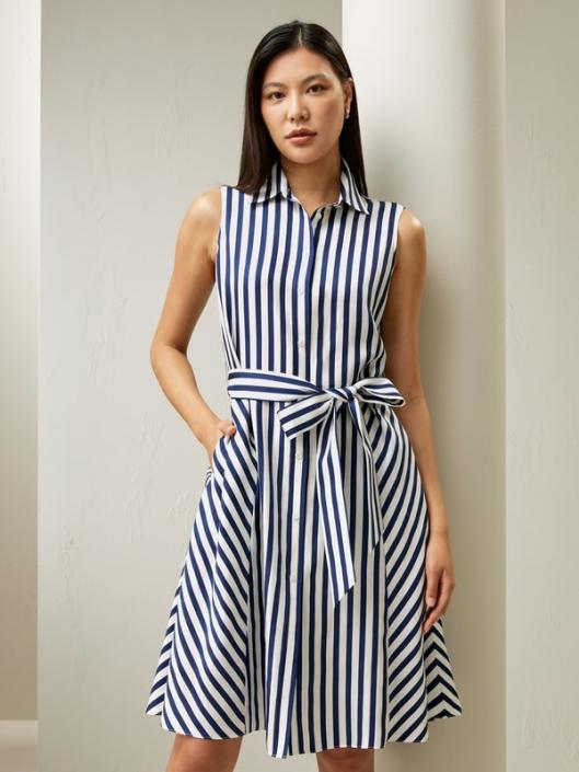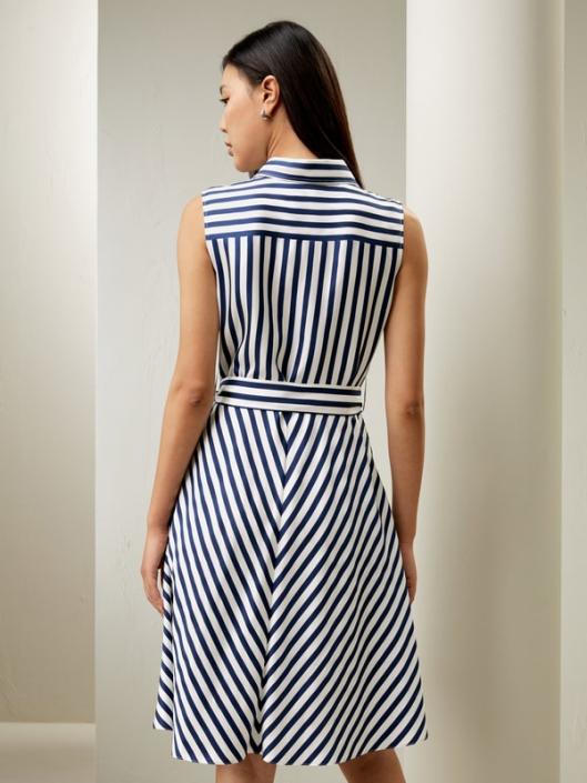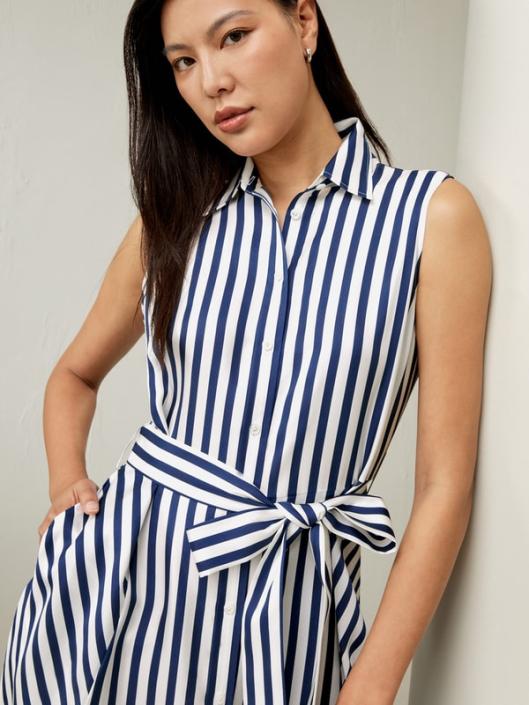 The Pinstriped Silk Sleeveless Dress provides a stunning and chick take on the popular summer dress! Featuring a classic navy style pinstripe pattern with new ways of shirt collar design. The dress includes a waist belt and pockets on both sides, making it easier and more comfortable to wear. Perfect for work-to-vacation wear, this dress transitions seamlessly from spring to summer. It is also a quite classic casual chic look which makes it easier to mix and match.-