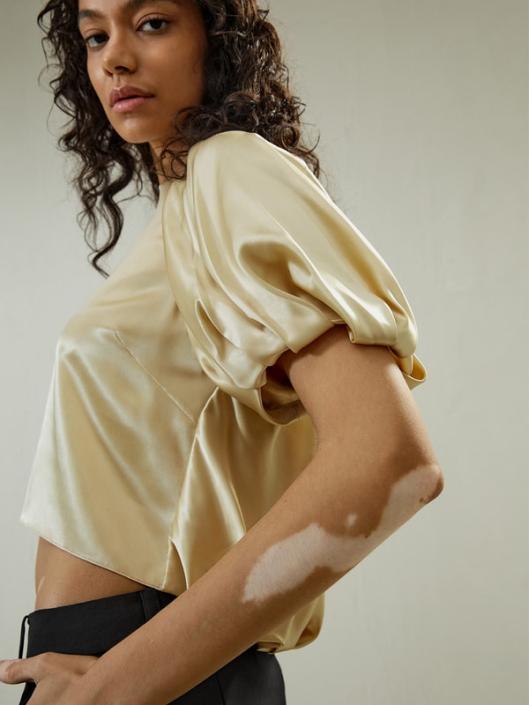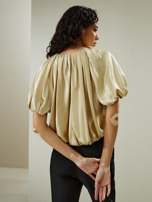 This Pleated Puff Short-sleeve top showcases our watershine silk charmeuse fabric which ensures breathability softness and incredible glossiness. A refined iteration of the round neckline, the voluminous pleated shoulder is crafted for a classic design. This Pleated Puff Short Sleeve Top style features a design short in front and long in back, which makes it a modern essential. Add this top to your wardrobe and you’ll have a go-to piece for any special occasion.-