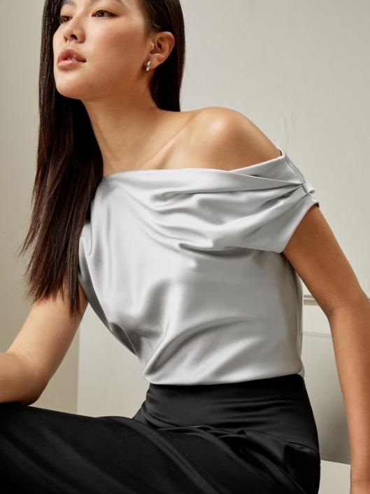 The Boat-Neck Silk top is an absolutely luxurious piece made from Silk Charmeuse. It features a slash shoulder which makes it elegant, and sexy with the simple shape. The cowl neck detailing, short flutter sleeves, and loop fastenings to the nape add an extra exquisite drape and feel. Perfect for both work and vacation, this top allows you to feel stylish and confident for any occasion.-