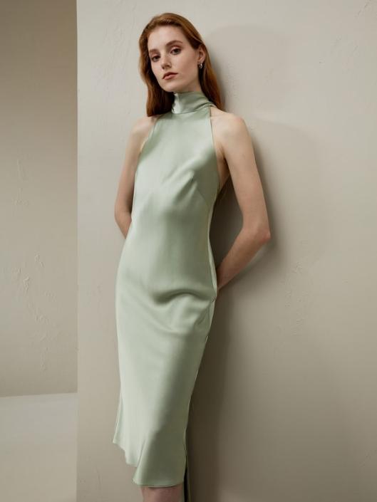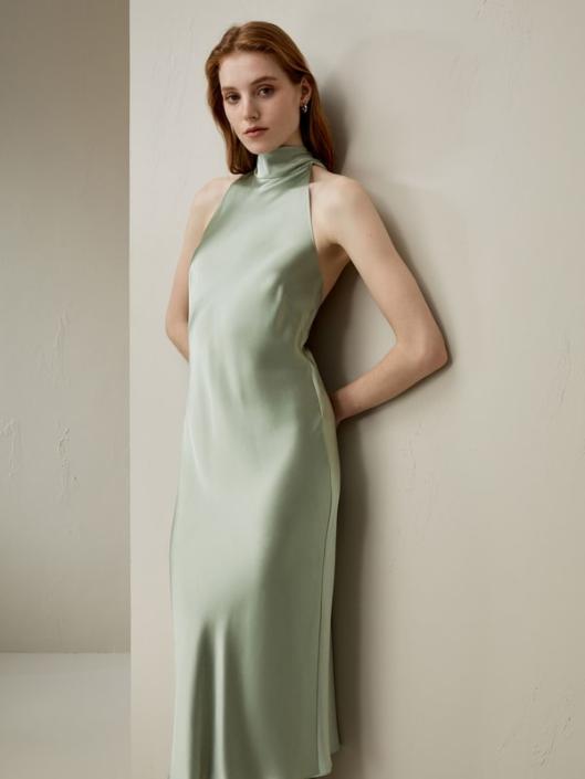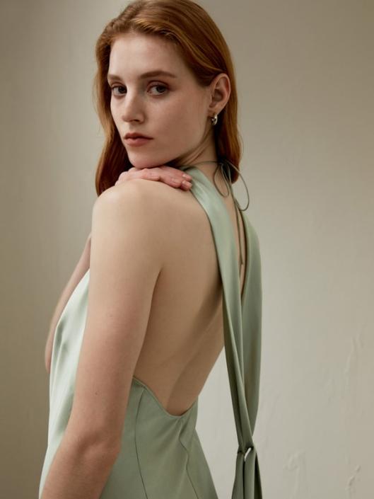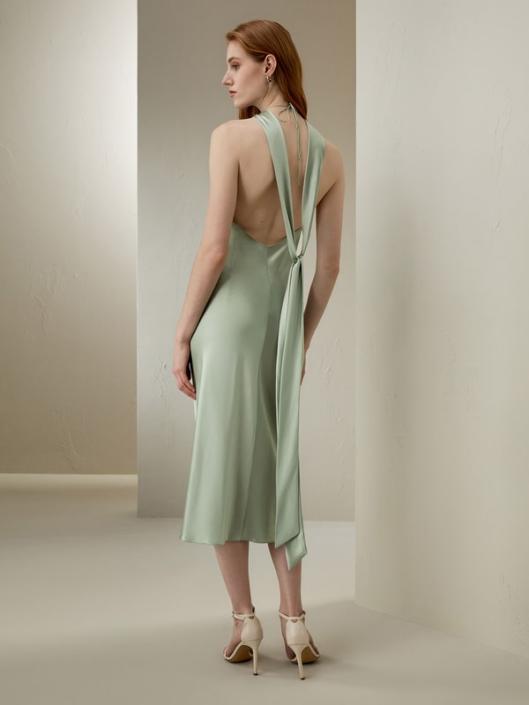 A modern twist on the classic halter neck dress. Striking in its simplicity, this light sage dress envelopes you in smooth and airy comfort, which enhances your silhouette and exudes a romantic summer vibe. It is designed with gorgeous back detailing—extra-long ribbon that cascades the dress elegantly down. Pair it with simple heels for a complete look for cocktail parties, vacations, and other casual occasions.-