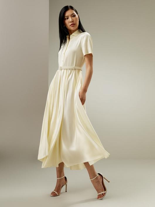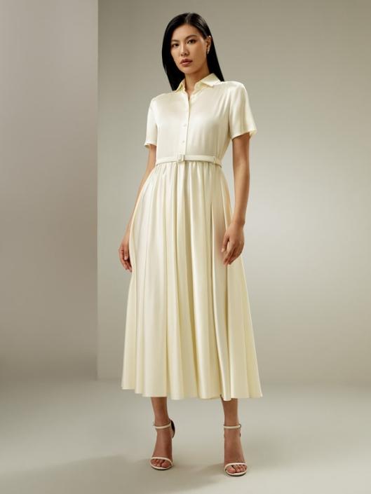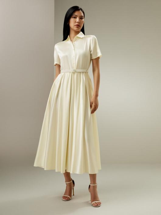Experience timeless elegance with our Moira Dress, showcasing a radiant sheen and fluid drape for a refined yet playful silhouette. The matching silk belt cinches the waist, while the classic shirt collar and button closure exude sophistication. Functional side pockets complete the sleek, polished design.-