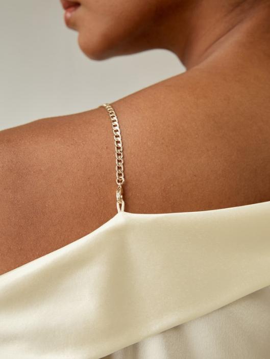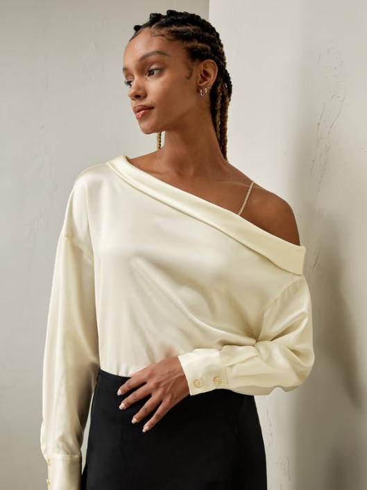 This stunning top features a slanted neckline with a narrow folded edge, creating an elegant and sophisticated look. The one-shoulder style adds a touch of allure, while the detachable light gold chain strap allows for versatile wearing options. The relaxed fit with dropped shoulders enhances the casual vibe, making it perfect for both dressy and casual occasions.-