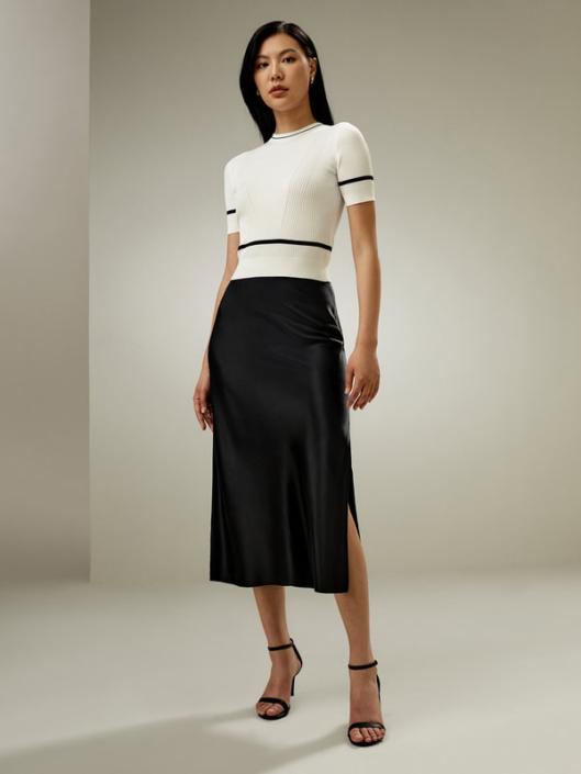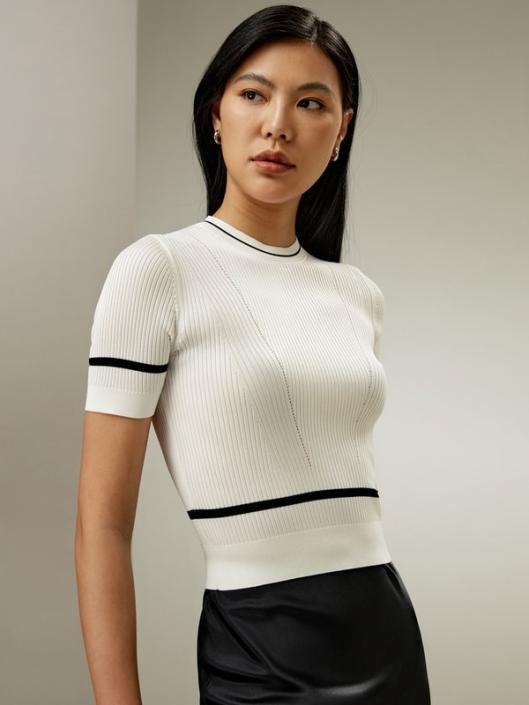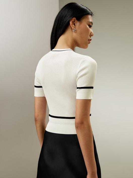 This basic ribbed knit short-sleeve top is crafted from white steam filature yarns, a premium mulberry silk. The crop top features a small round collar, ribbed cuffs and hem, and contrasting trim. Its slim fit and cropped length make it a versatile and timeless piece, perfect for casual everyday wear.-