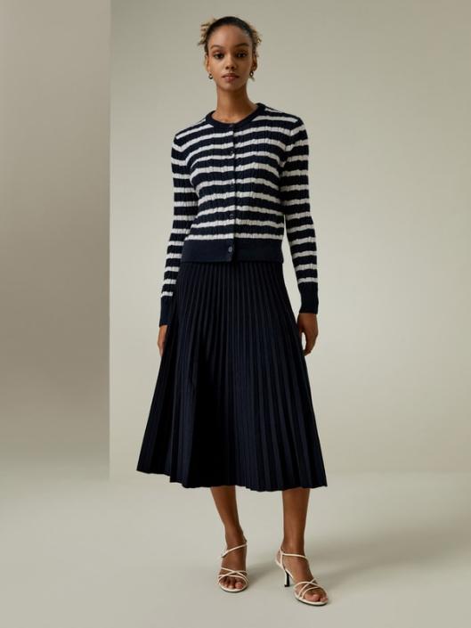 Incorporating our iconic cable-knit construction with a sophisticated blue-and-white striped motif, this long-sleeve cardigan masterfully creates a captivating interplay of textures. Meticulously designed for a slim and flattering fit, it epitomizes timeless elegance.-