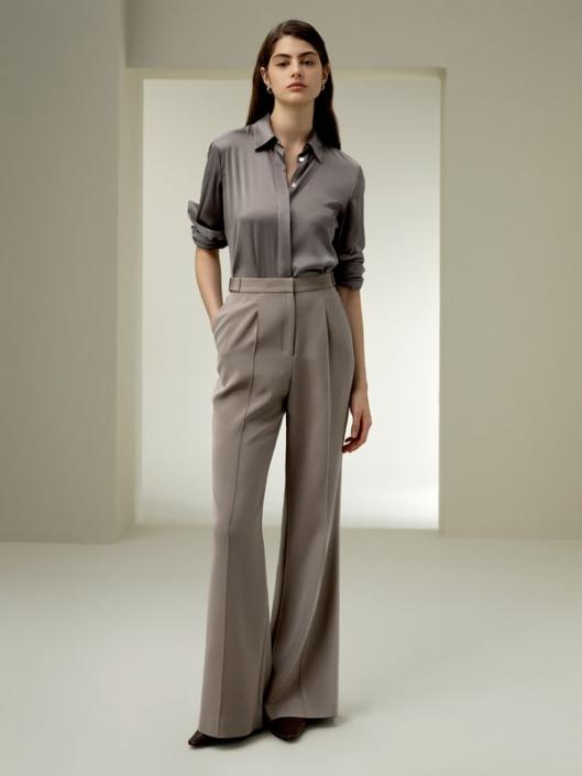 These subtle-flared suit trousers are made of luxurious elastic heavy crepe silk, providing the trousers with excellent drapes, shaping the legs elegantly. The subtle flare design breaks traditional formal stereotypes, adding fashion elements while maintaining a professional look. Carefully designed pleats and leg room provide comfort and freedom of movement. The elastic back waist enhances adaptability to different body shapes for a comfortable fit.-